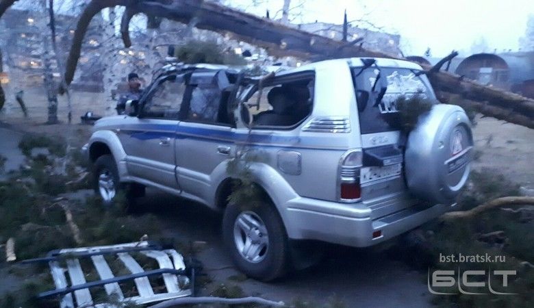 Как видно на снимках, потоки воздуха по всему городу срывали металлические листы с заборов, кровлю, разбивали окна и ломали деревья. Одно из них при падении угодило в автомобиль, припаркованный недалеко от Братского госуниверситета.