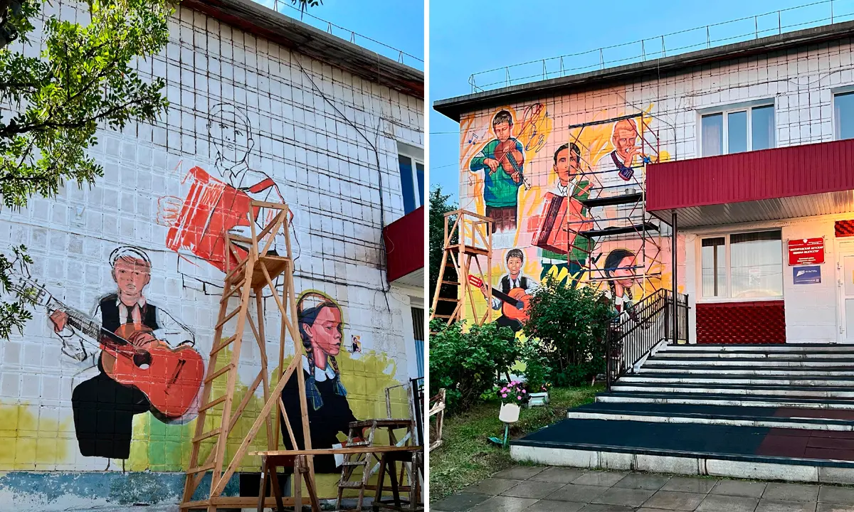 Первый в истории Вихоревки мурал заканчивает прямо сейчас художник из Новосибирска Куаныш Сураганов. Масштабную картину он создаёт на фасаде здания детской школы искусств, в качестве подарка юным коллегам и педагогам.