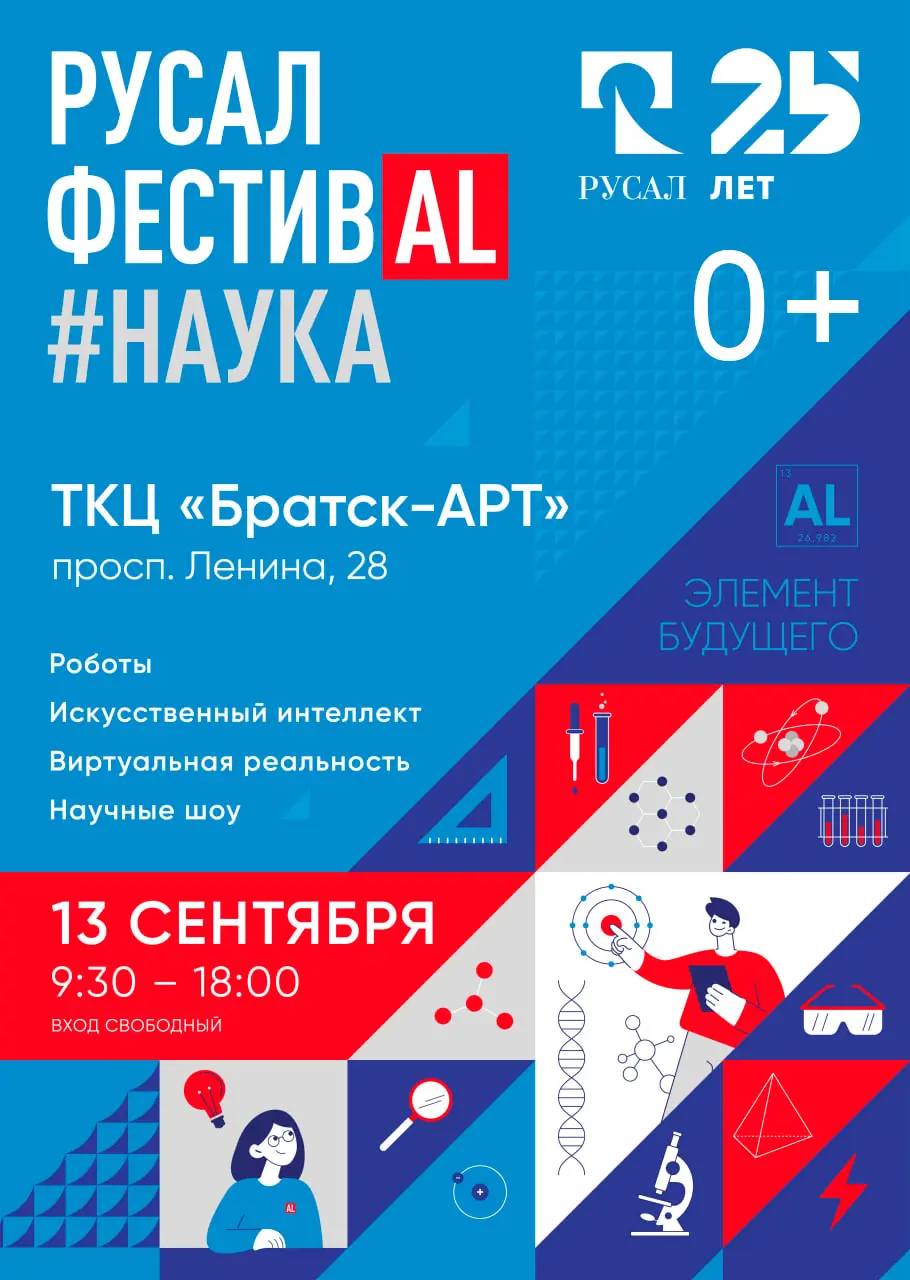 В ближайшую субботу, 13 сентября, в ТКЦ «Братск-Арт» с 09.30 до 18.00 часов пройдет масштабный интеллектуальный фестиваль «РУСАЛ ФестивAL#Наука». В этом году он посвящен 25-летию компании.