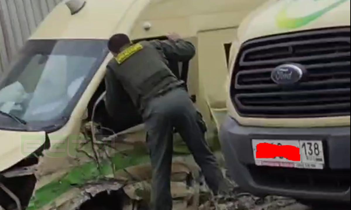 По кадрам видно, что у белой «Тойоты» сильно повреждена передняя часть. Капот и бампер деформированы. От столкновения легковой автомобиль съехал с дороги. Неподалёку, по другую сторону трассы, находится повреждённая инкассаторская машина. Микроавтобус также сильно пострадал от удара в переднюю часть слева.